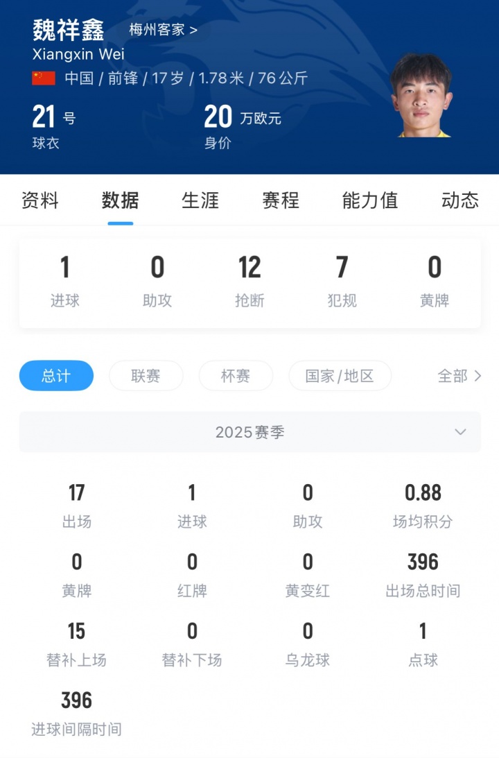 今年上半年,魏祥鑫曾前往欧塞尔试训。本赛季魏祥鑫为梅州出战17场收获1球。